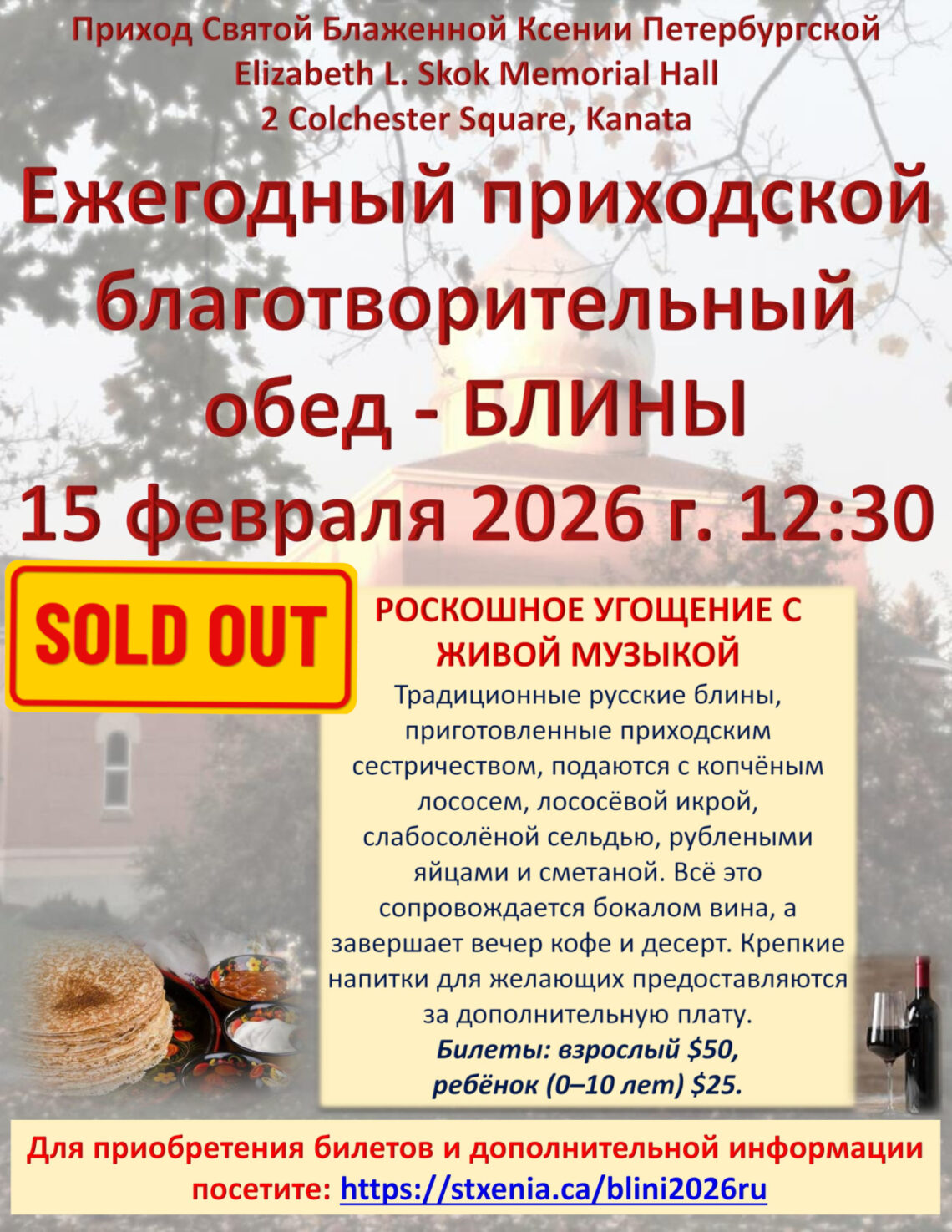 Мы призываем всех прихожан храма Святой Ксении посетить это мероприятие и пригласить своих друзей принять участие в этом увлекательном традиционном обеде. Билеты для взрослых стоят 50 долларов, а для детей до 10 лет — 25 долларов. Пожалуйста, приобретайте билеты заранее, задолго до 15 февраля. Билеты можно приобрести у любого члена Совета или связавшись с приходским старостой Михаилом Поповичем по телефону 613-614-8154 или старшей сестрой Матушкой Сарой Камбитес по телефону 613-276-8010.